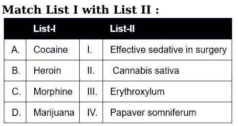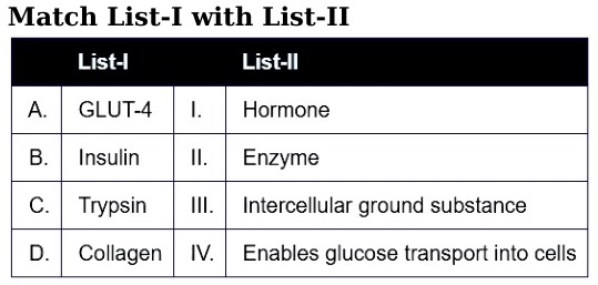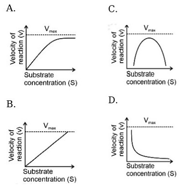 Biomolecules Chemistry Online Mock Test: NEET PYQBy admin / January 12, 2025 Uncategorized 5/5 - (1 vote) 0% 1 Report a question What’s wrong with this question? You cannot submit an empty report. Please add some details. Biomolecules Chemistry NEET PYQ 2024-22 NEET = National Eligibility-cum-Entrance Test No of Questions: 15 MCQs Time: 20 Minutes Practicing questions from a variety of competitive exams is really valuable. For instance, working on these questions can still sharpen your problem-solving abilities and boost your confidence. Many topics overlap, so broader practice often leads to stronger overall performance 1 / 15 1. Which of the following are not fatty acids? (निम्नलिखित में से कौन-से वसीय अम्ल नहीं हैं?)A. Glutamic acid (ग्लूटामिक अम्ल)B. Arachidonic acid (एराकिडोनिक अम्ल)C. Palmitic acid (पामिटिक अम्ल)D. Lecithin (लेसिथिन)E. Aspartic acid (एस्पार्टिक अम्ल) Choose the correct answer from the options given below: (नीचे दिए गए विकल्पों में से सही उत्तर चुनिए:)[NEET 2024 Re] A. C, D and E only (केवल C, D और E) B. A and B only (केवल A और B) C. A, D and E only (केवल A, D और E) D. B and C only (केवल B और C) Solution:Glutamic acid (ग्लूटामिक अम्ल) and Aspartic acid (एस्पार्टिक अम्ल) are amino acids (अमीनो अम्ल), not fatty acids.Lecithin (लेसिथिन) is a phospholipid (फॉस्फोलिपिड), not a fatty acid.Palmitic acid (पामिटिक अम्ल) and Arachidonic acid (एराकिडोनिक अम्ल) are fatty acids (वसीय अम्ल).Therefore, A, D, and E are not fatty acids, so option C is correct. 2 / 15 2. Which of the following graphs depicts the effect of substrate concentration on velocity of enzyme catalysed reaction? (निम्नलिखित में से कौन-सा ग्राफ एंजाइम-उत्प्रेरित अभिक्रिया में सब्सट्रेट सांद्रता का अभिक्रिया वेग पर प्रभाव दर्शाता है?)[NEET 2024 Re] A B C D Solution:In an enzyme-catalysed reaction (एंजाइम-उत्प्रेरित अभिक्रिया), as substrate concentration (सब्सट्रेट सांद्रता) increases, the reaction velocity (अभिक्रिया वेग) also increases initially because more enzyme active sites are available. After a certain point, all active sites become saturated (संतृप्त), so the reaction reaches a maximum velocity called Vmax (अधिकतम वेग). Therefore, the correct graph is the hyperbolic curve shown in option A. 3 / 15 3. Melonate inhibits the growth of pathogenic bacteria by inhibiting the activity of (मैलोनेट रोगजनक बैक्टीरिया की वृद्धि को किस एंजाइम की क्रिया को अवरुद्ध करके रोकता है?) [NEET 2023] A. Amylase (एमाइलेज) B. Lipase (लिपेज़) C. Dinitrogenase (डाइनाइट्रोजनेज़) D. Succinic dehydrogenase (सक्सिनिक डिहाइड्रोजनेज़) Solution: Malonate (मैलोनेट) is a competitive inhibitor (प्रतिस्पर्धी अवरोधक) of succinic dehydrogenase (सक्सिनिक डिहाइड्रोजनेज़), thus inhibiting bacterial growth. 4 / 15 4. Choose the correct answer from the options given below [NEET 2024] A. A-IV, B-I, C-II, D-III B. A-I, B-II, C-III, D-IV C. A-II, B-III, C-IV, D-I D. A-III, B-IV, C-I, D-II 5 / 15 5. Match List I with List II and choose the correct answer from the options given below: (सूची I का सूची II से मिलान कीजिए और नीचे दिए गए विकल्पों में से सही उत्तर चुनिए:) [NEET 2024 Re] List I: A. Primary structure of protein (प्रोटीन की प्राथमिक संरचना)B. Secondary structure of protein (प्रोटीन की द्वितीयक संरचना)C. Tertiary structure of protein (प्रोटीन की तृतीयक संरचना)D. Quaternary structure of protein (प्रोटीन की चतुर्थक संरचना) List II: I. Human haemoglobin (मानव हीमोग्लोबिन)II. Disulphide bonds (डाइसल्फाइड बंध)III. Polypeptide chain (पॉलीपेप्टाइड श्रृंखला)IV. Alpha helix and β-sheet (अल्फा हेलिक्स और बीटा-शीट) A. A-III, B-IV, C-II, D-I B. A-III, B-II, C-I, D-IV C. A-I, B-III, C-II, D-IV D. A-IV, B-III, C-II, D-I Solution:Primary structure (प्राथमिक संरचना) refers to the linear sequence of amino acids in a polypeptide chain (पॉलीपेप्टाइड श्रृंखला), so A matches III. Secondary structure (द्वितीयक संरचना) includes alpha helix and beta-sheet (अल्फा हेलिक्स और बीटा-शीट), so B matches IV. Tertiary structure (तृतीयक संरचना) is stabilised by interactions such as disulphide bonds (डाइसल्फाइड बंध), so C matches II. Quaternary structure (चतुर्थक संरचना) is seen in proteins made of multiple polypeptide chains, such as human haemoglobin (मानव हीमोग्लोबिन), so D 