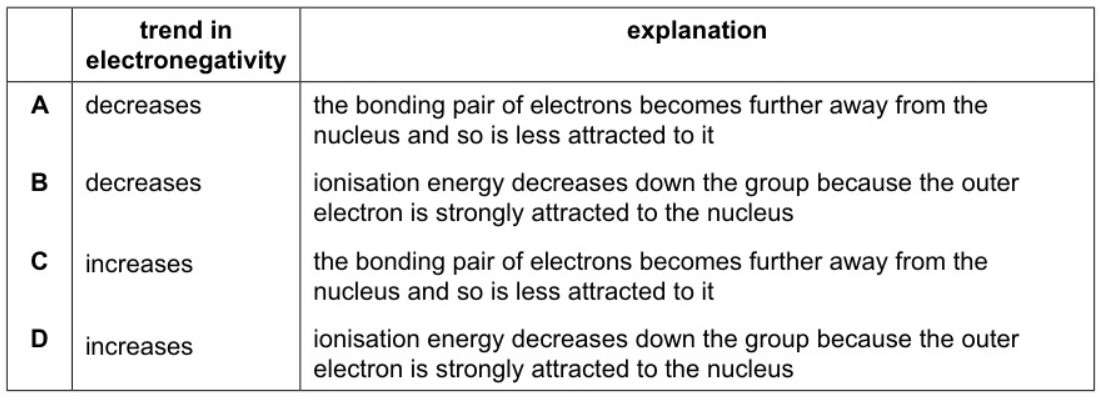 SLST IX-X Physical Science Online Free Mock Test: Set 1By admin / November 28, 2025 SLST IX-X Physical Science 5/5 - (1 vote) /60 1 Table of Contents Toggle Report a questionShort ExplanationShort ExplanationShort ExplanationShort ExplanationShort Explanation Report a question What’s wrong with this question? You cannot submit an empty report. Please add some details. SLST IX-X Physical Science Online Free Mock Test: Set 1 CHEMISTRY + PHYSICS: Set/01 - Hard Paper 1 Multiple Choice Question: 60 MCQs SPECIMEN PAPER: 2 hour The total mark for this paper is 60. Each correct answer will score one mark 1 / 60 1. The hydrogen molecule contains a covalent bond. What holds the atoms together in this covalent molecule? A. the electrostatic attraction between the atoms in the molecule B. the electrostatic attraction between the electron of one hydrogen atom and the nucleus of the other hydrogen atom C. the electrostatic attraction between the electrons in the bond pair and the two nuclei D. the energy released in the formation of the covalent bond Short Explanation In a covalent bond (like in H₂), the atoms are held together by electrostatic attraction between the shared pair of electrons and both nuclei. The bonding electrons are attracted to both hydrogen nuclei, creating a stable bond. Options A and B are incomplete descriptions. Option D is incorrect because energy release is a result, not the force holding atoms together. 2 / 60 2. Q2. The actual values of the masses of three sub-atomic particles are shown in the table: Particle Mass (kg) proton 1.673 × 10⁻²⁷ neutron 1.675 × 10⁻²⁷ electron 9.109 × 10⁻³¹ Which nickel ion is predicted to have a mass of 1.038 × 10⁻²⁵ kg from these data? A. ⁵⁸₂₈Ni³⁺ B. ⁶⁰₂₈Ni²⁺ C. ⁶²₂₈Ni²⁺ D. ⁶⁴₂₈Ni³⁺ Short Explanation Mass of an atom ≈ (protons + neutrons) × 1.67 × 10⁻²⁷ kg Electron mass is very small, so we ignore it. Now check: For Ni-62 → total nucleons = 62Mass ≈ 62 × 1.67 × 10⁻²⁷≈ 1.035 × 10⁻²⁵ kg (very close to given 1.038 × 10⁻²⁵) Other options give masses further away. ✔ So, Ni-62²⁺ is the best match. 3 / 60 3. Which statement about 1 mol of a metal is always correct? A. It contains the same number of atoms as 1 mol of hydrogen atoms. B. It contains the same number of atoms as 1/12 mol of ¹²C atoms. C. It has the same mass as 1 mol of hydrogen atoms. D. It is liberated from its ions by 1 mol of electrons. Short Explanation 1 mole of any element always contains Avogadro’s number (6.02 × 10²³) of atoms. So, 1 mol of a metal has the same number of atoms as 1 mol of hydrogen atoms. Why others are wrong: B: 1/12 mol has fewer atoms C: Mass depends on molar mass, not same D: Depends on charge of ion, not always 1 mol electrons ✔ Therefore, A is always correct. 4 / 60 4. Which statement about this structure ice crystal is correct? A. All the bond angles surrounding each oxygen atom are 120°. B. Four electrons from each oxygen atom are involved in forming hydrogen bonds. C. The hydrogen bonds, shown by the dotted line, are stronger than the O–H covalent bonds. D. The open structure of ice causes ice to be denser than water. Short Explanation Each oxygen atom has two lone pairs (4 electrons). These lone pairs are responsible for forming hydrogen bonds with neighboring H atoms. Why others are wrong: A: Bond angle is ~104.5°, not 120° C: Hydrogen bonds are weaker than covalent bonds D: Ice is less dense than water due to open structure ✔ Hence, B is correct. 5 / 60 5. The head of the first type of match, called a ‘lucifer’, contained a mixture of antimony(III) sulfide and potassium chlorate(V). When the match was ‘struck’, the following reaction took place: Sb₂S₃(s) + 3KClO₃(s) → Sb₂O₃(s) + 3KCl(s) + 3SO₂(g) Which element is reduced in the reaction? A. antimony B. chlorine C. oxygen D. sulfur Short Explanation To find reduction, check oxidation state decreases: In KClO₃, chlorine = +5 In KCl, chlorine = −1 So chlorine changes: +5 → −1 → reduction Other changes: Sulfur: −2 → +4 (oxidation) Antimony: remains +3 ✔ Therefore, chlorine is reduced. 6 / 60 6. Use of the data booklet is relevant to this question. The successive ionisation energies, in kJ mol⁻¹, of an element X are given: 870, 1800, 3000, 3600, 5800, 7000, 13200 What is X? A. ₃₃As B. ₄₀Zr C. ₅₂Te D. ₅₃I Short Explanation Look for the big jump in ionisation energy: 870 → 1800 → 3000 → 3600 → 5800 → 7000 → 13200 The biggest jump is after removing 6 electrons: This means X has 6 valence electrons. Elements with 6 valence electrons belong to Group 16. From options: As → Group 15 ❌ Zr → Group 4 ❌ Te → Group 16 ✅ I → Group 17 ❌ ✔ Therefore, X = Tellurium (Te). 7 / 60 7. Synthetic rubber is commonly produced from the monomer buta-1,3-diene. What are the numbers of σ bonds and π bonds present in one molecule of buta-1,3-diene? 6,4 7,4 8,2 9,2 8 / 60 8. Polymerisation of ethene gives poly(ethene). How does the carbon-carbon bond in poly(ethene) compare with that in ethene? A. The carbon-carbon bond is longer and stronger in poly(ethene). B. The carbon-carbon bond is longer and weaker in poly(ethene). C. The carbon-carbon bond is shorter and stronger in poly(ethene). D. The carbon-carbon bond is shorter and weaker in poly(ethene). Short Explanation In ethene (C=C), the carbon-carbon bond is a double bond: shorter stronger In poly(ethene), the double bond opens to form single C–C bonds: longer weaker ✔ Therefore, the C–C bond in poly(ethene) is longer and weaker than in ethene. 9 / 60 9. The elements phosphorus, sulfur and chlorine all exhibit covalent bonding. Their melting points are listed: phosphorus: 44°C sulfur: 115°C chlorine: −101°C What accounts for these differences in melting points? A. the number of bond pairs in the molecules B. the number of electrons in the atoms C. the number of ele